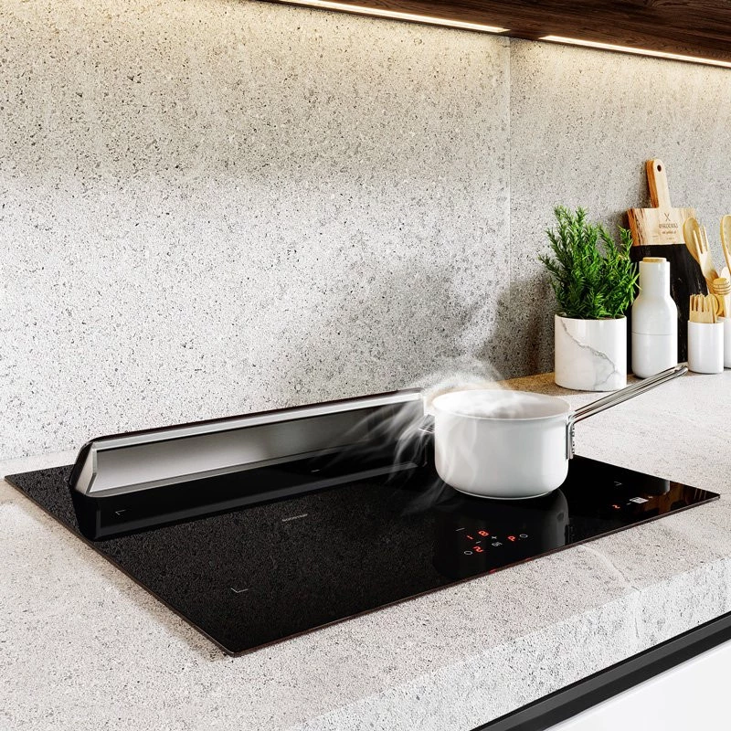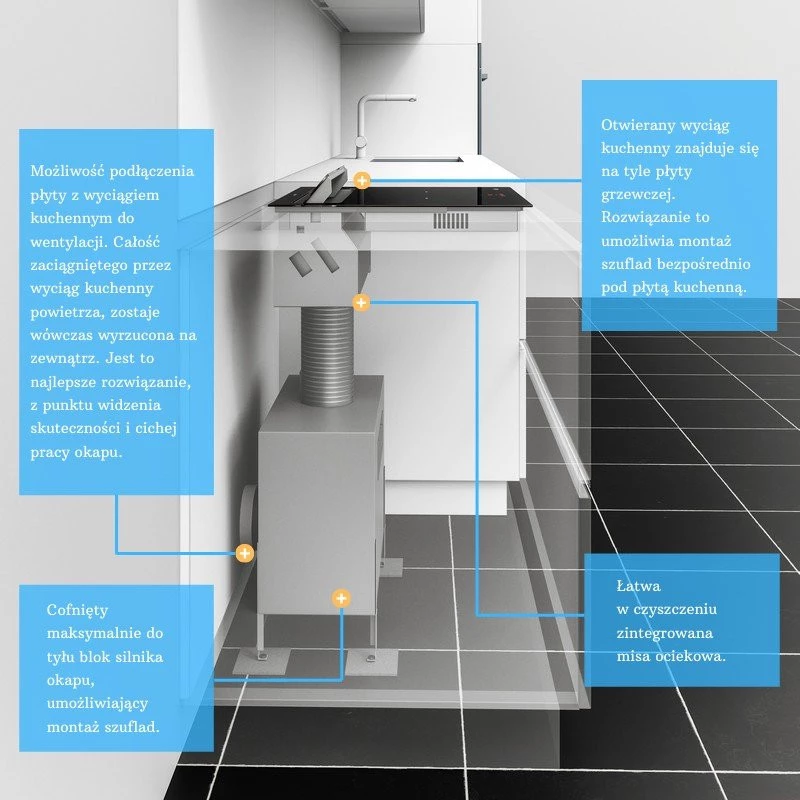 - Dzięki możliwości rezygnacji z tradycyjnego okapu, zyskuje się wolną przestrzeń w zabudowie kuchennej.